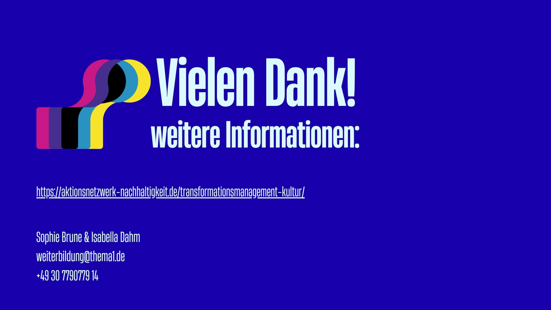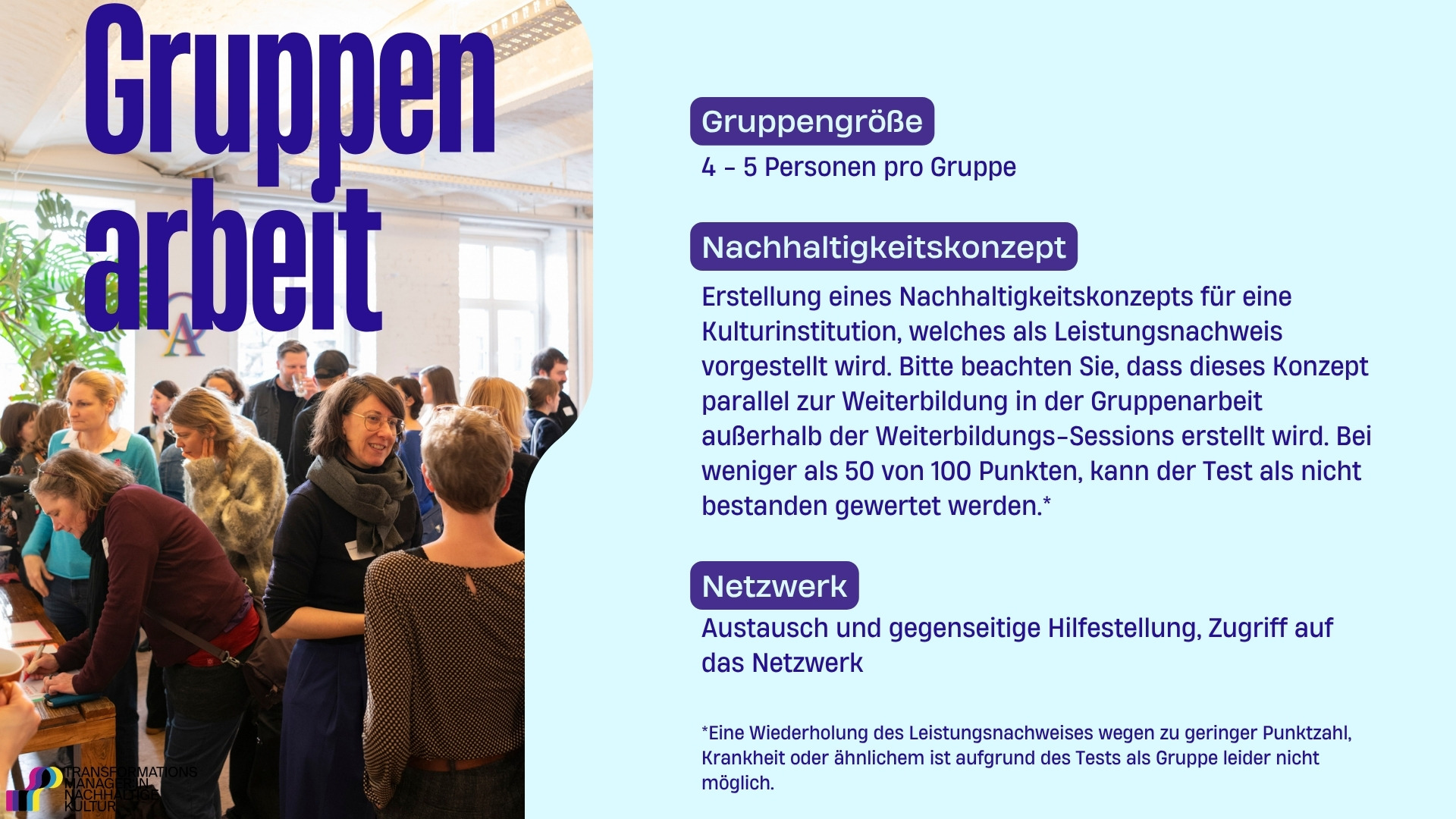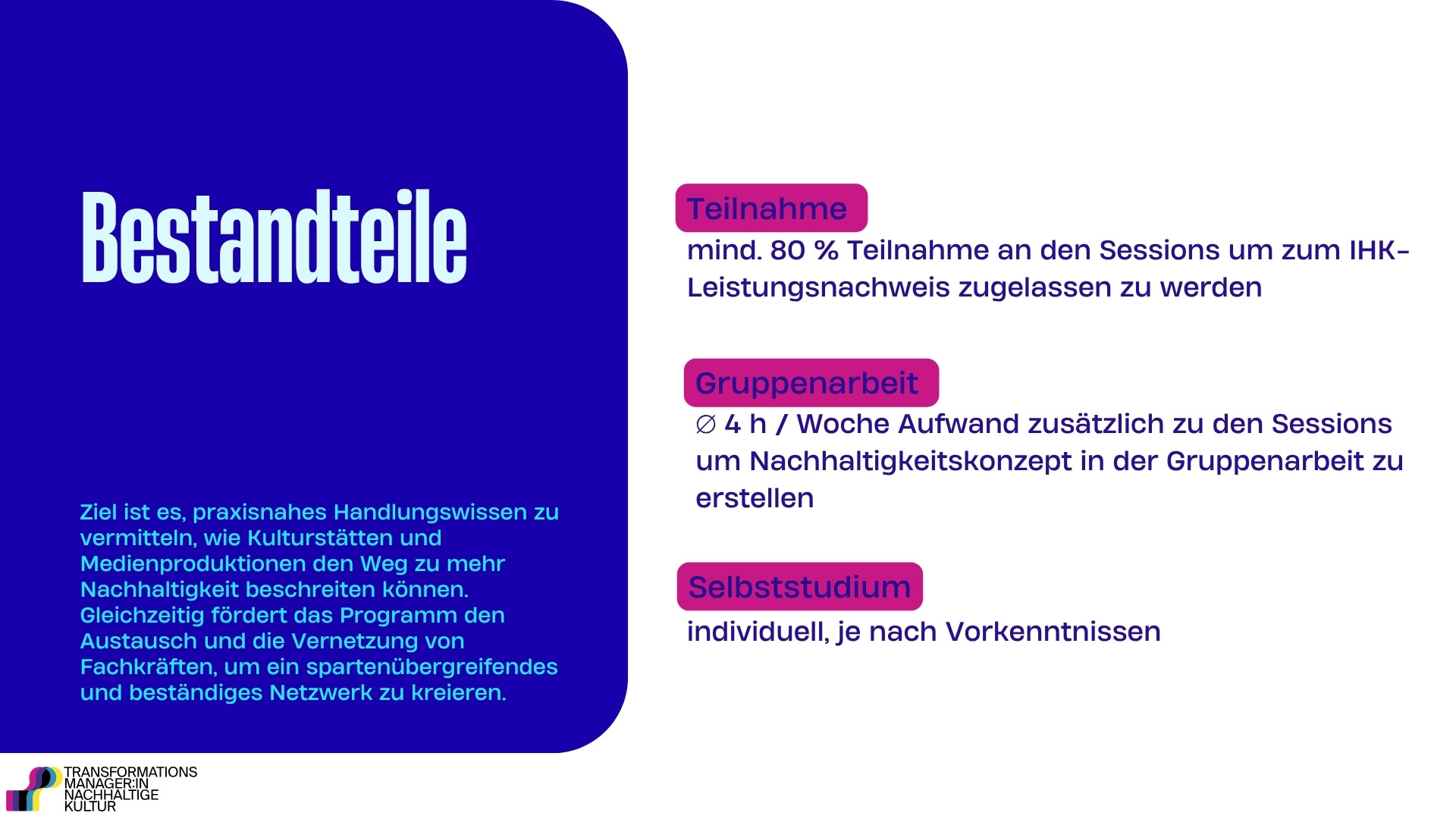 Ein besonderer Fokus liegt auf der praxisnahen Anwendung, denn gemeinsam mit erfahrenen Fachexpert:innen und Referent:innen, die selbst aktiv an Transformationsprozessen arbeiten, entwickeln die Teilnehmenden konkrete Lösungen für ihren eigenen Arbeitskontext und erstellen in einer Gruppenarbeit ein Nachhaltigkeitskonzept für eine reale kulturelle Institution.