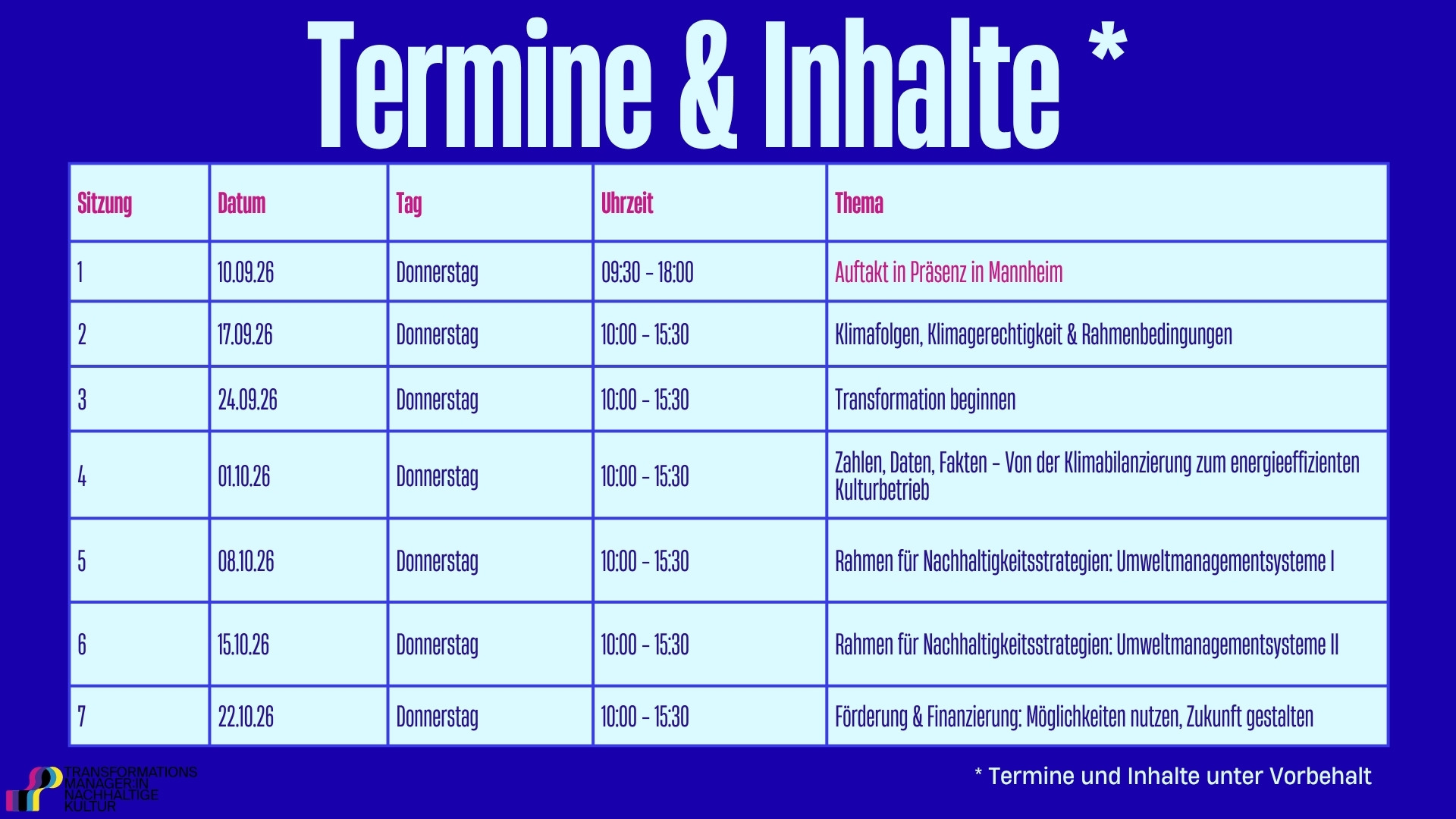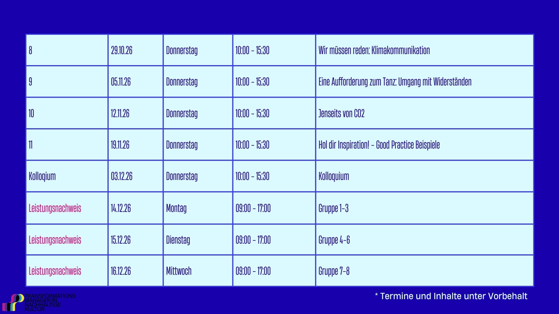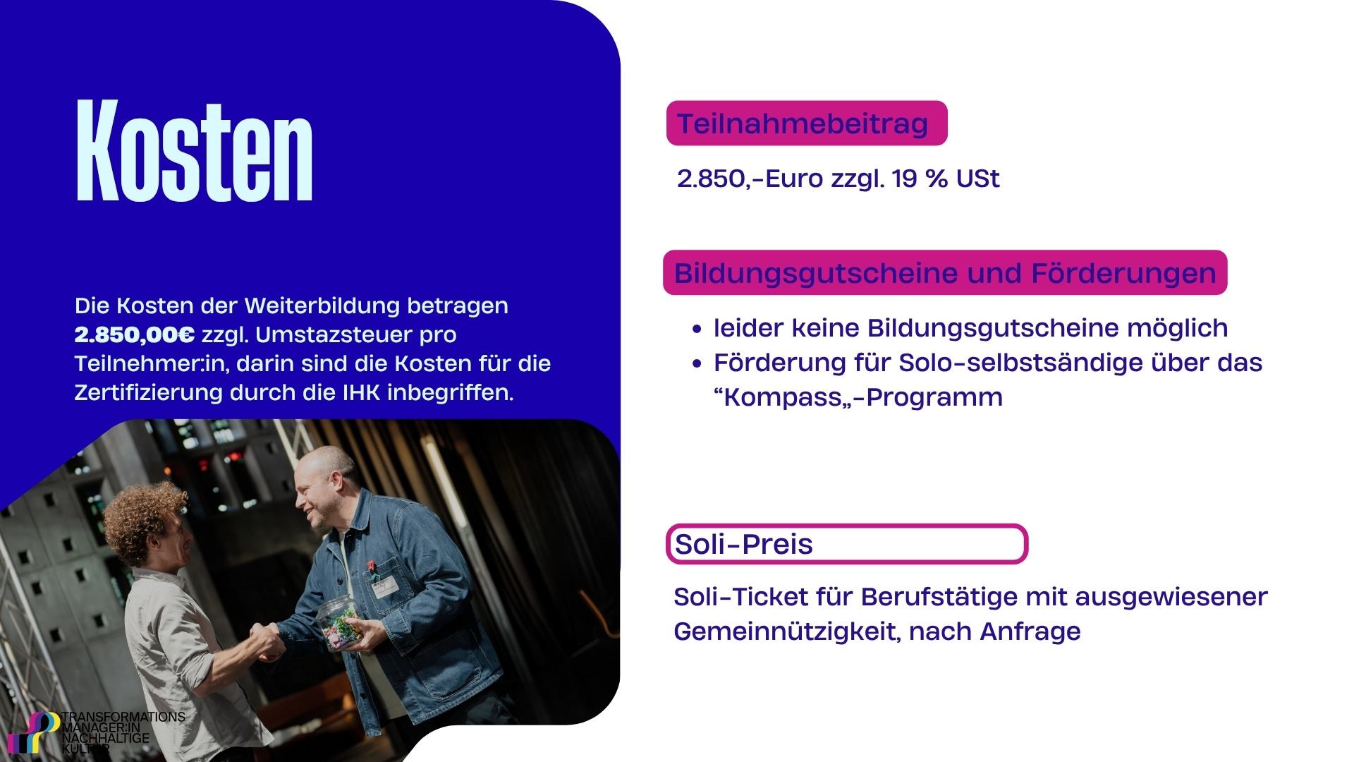 Ein besonderer Fokus liegt auf der praxisnahen Anwendung, denn gemeinsam mit erfahrenen Fachexpert:innen und Referent:innen, die selbst aktiv an Transformationsprozessen arbeiten, entwickeln die Teilnehmenden konkrete Lösungen für ihren eigenen Arbeitskontext und erstellen in einer Gruppenarbeit ein Nachhaltigkeitskonzept für eine reale kulturelle Institution.