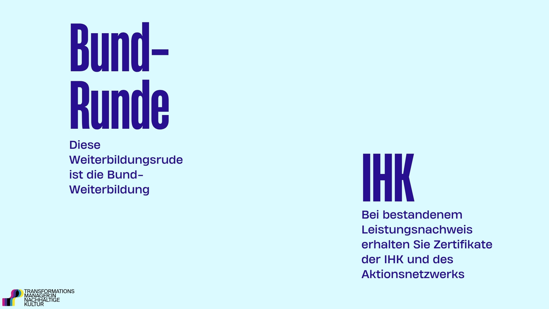 Die IHK Rhein-Neckar zertifizierte Weiterbildung richtet sich an Akteur:innen und Multiplikator:innen im Kulturbereich sowie in der Kreativwirtschaft, die auf unterschiedlichen Ebenen tätig sind und Transformationsprozesse in ihren Institutionen und ihren Projekten aktiv gestalten möchten.