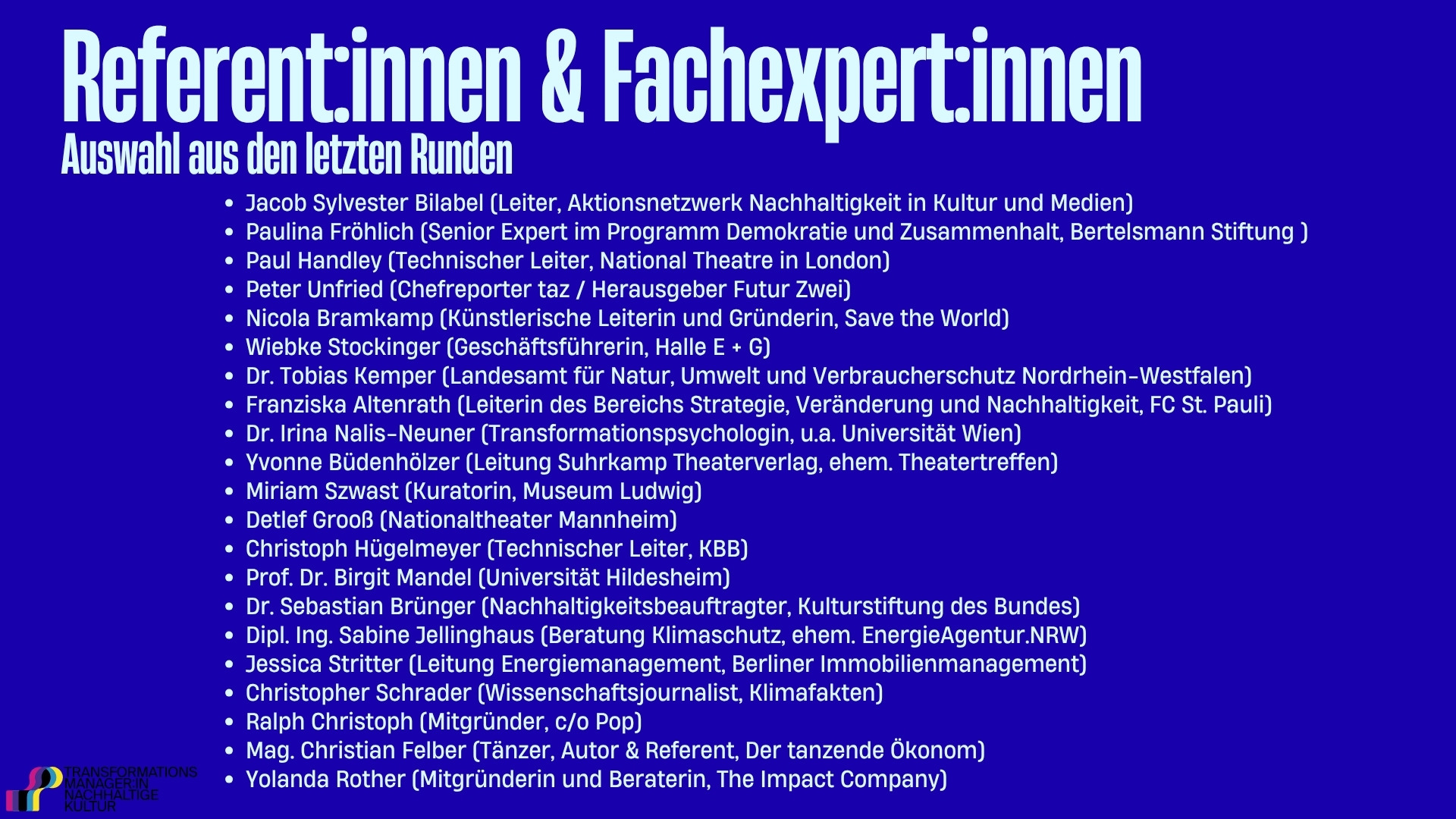 Ganz gleich, ob in Theater, Museum, Stiftungen, Bibliotheken, Verwaltung oder freier Szene im Fokus stehen Menschen, die Verantwortung übernehmen und nachhaltige Veränderungen in ihren Arbeitskontexten voranbringen wollen.
