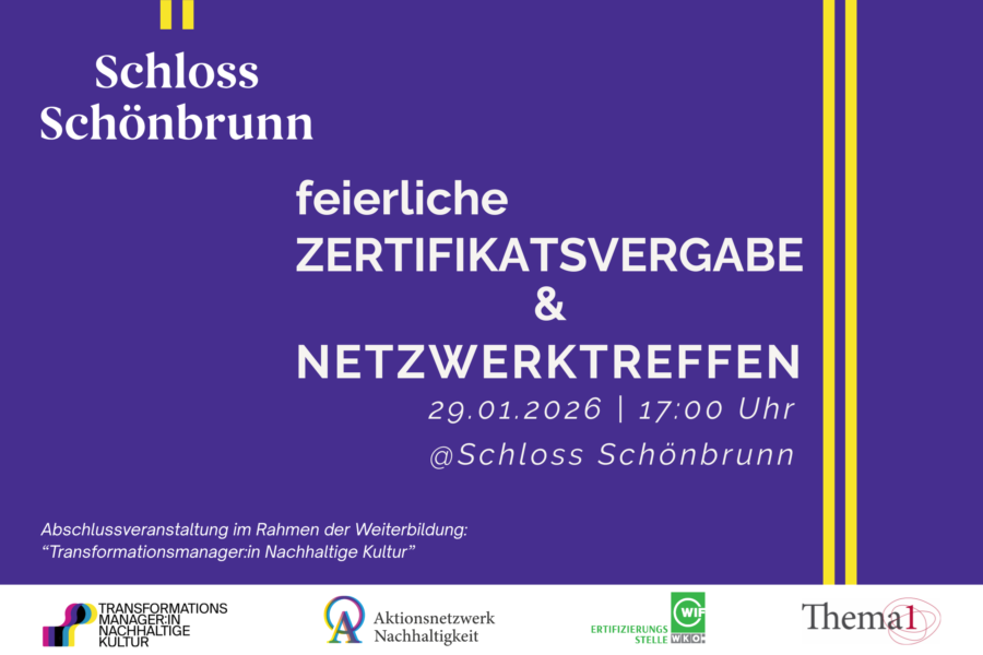 Ein Abend für Vernetzung im Sinne der ökologischen Transformation der Kultur Wir feiern einen wichtigen Meilenstein: Unsere Pilot-Runde der WIFI-zertifizierten Weiterbildung „Transformationsmanager:in Nachhaltige Kultur“ findet ihren feierlichen Abschluss und das in einem besonderen Rahmen: im Schloss Schönbrunn. Die Veranstaltung ist nicht nur eine Würdigung unserer Teilnehmer:innen, die in den vergangenen Monaten bravourös an Wissen, Konzepten und Zukunftsstrategien […]