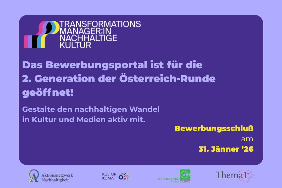 In Kooperation mit der WIFI Zertifizierungsstelle der Wirtschaftskammer Österreich und der österreichischen Plattform KULTURKLIMA hat das Aktionsnetzwerk die Weiterbildung „Transformationsmanager:in Nachhaltige Kultur“ speziell für Kulturinstitutionen und Kulturschaffende aus Österreich weiterentwickelt. Die Weiterbildung wird durch die Thema1 GmbH angeboten. Bei der notwendigen Transformation zu einer klimagerechten Gesellschaft spielt der Kultur- und Mediensektor eine entscheidende Rolle. Um jedoch diese Aufgabe auszufüllen, gibt es einen wachsenden Bedarf an Expert:innen in Österreich, die im Kultur- und Medienbereich beraten und mitwirken. Das Weiterbildungsangebot unterstützt motivierte Akteur:innen dabei, diese transformative Rolle einzunehmen. Ziel der Weiterbildung „Transformationsmanger:in Nachhaltige Kultur“ ist es, Handlungswissen zu vermitteln, wie Kulturstätten und Medienproduktionen den Weg zu mehr Nachhaltigkeit beschreiten können. Neben der Wissensvermittlung dient das Angebot zudem der Vernetzung von Akteur:innen untereinander, welche hier verstärkt in Österreich stattfinden wird.